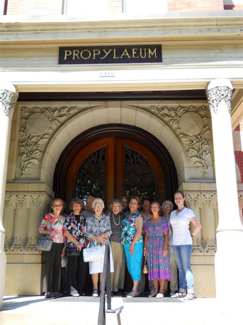 A day-trip is always fun, and the Society members who drove into Indianapolis in early July to visit the Propylaeum on Delaware Street for a tour and lunch had a good time. The big “Queen Anne style” mansion is the headquarters for a woman’s organization to “encourage the appreciation of the arts for the public, and especially for women." The name itself means “Gateway.”